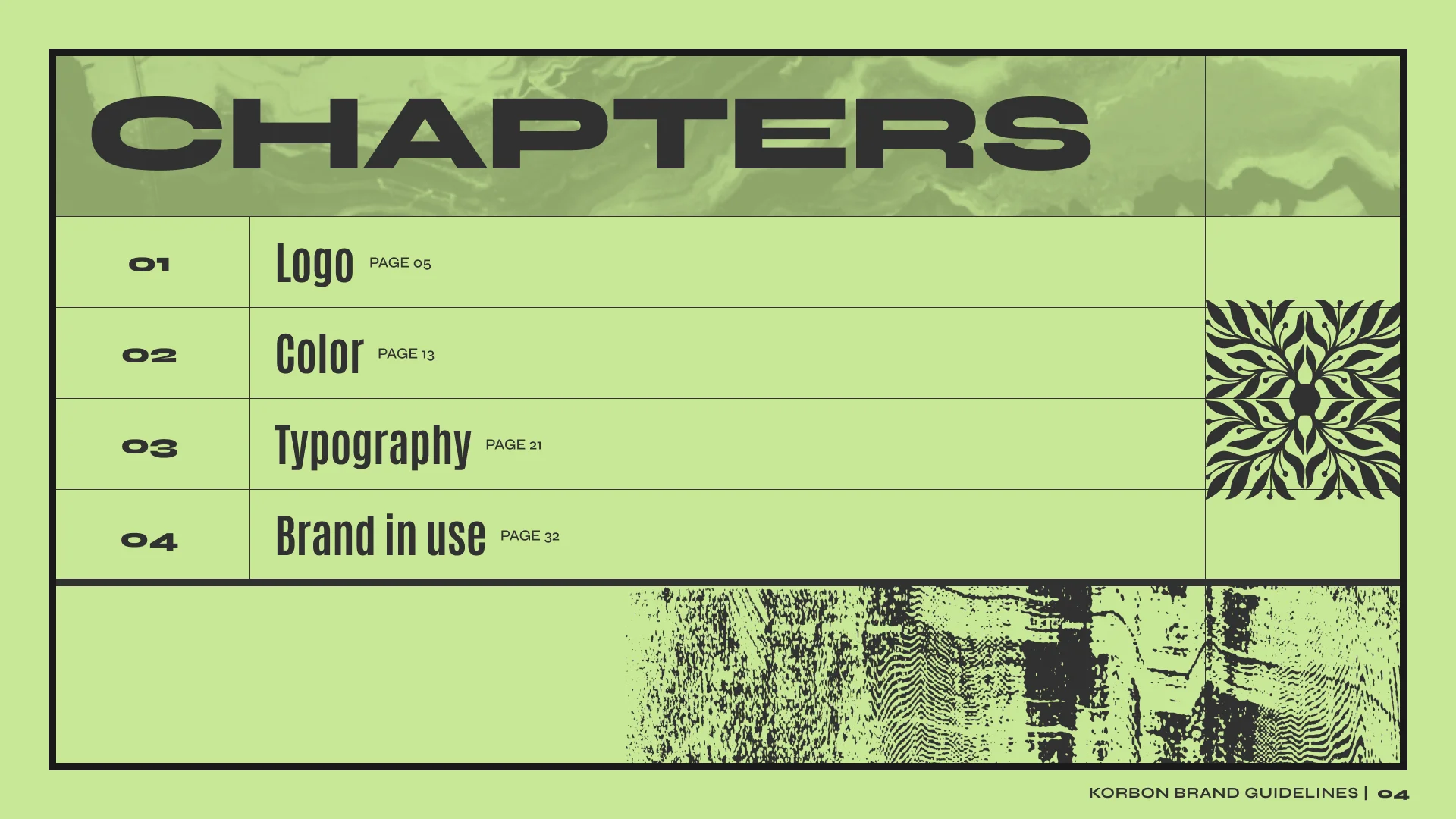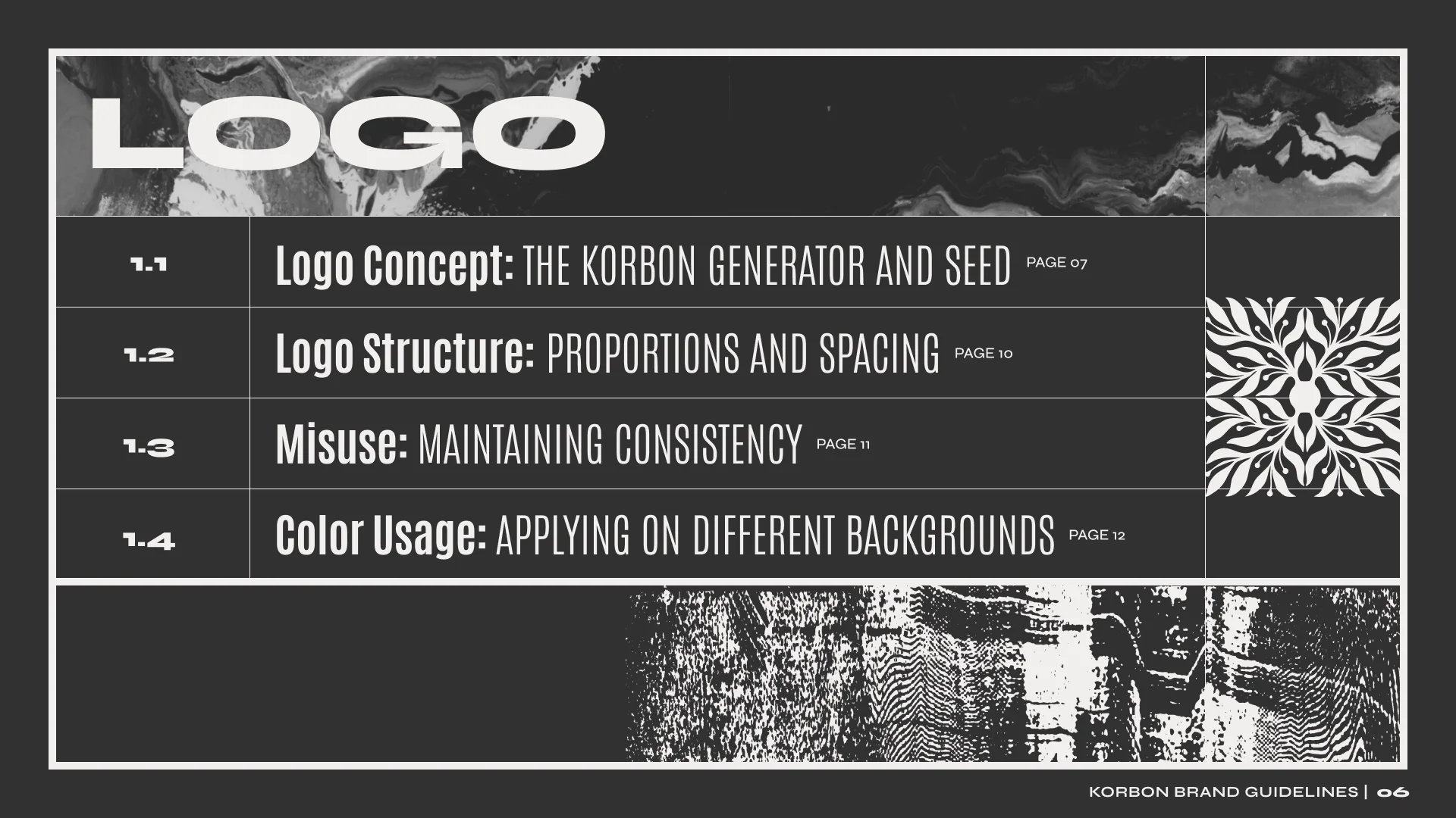 The project produced a complete brand system: logo design, visual identity guidelines, website design, and conceptual visual explorations. These artifacts established the visual language through which Korbon communicates its work.
