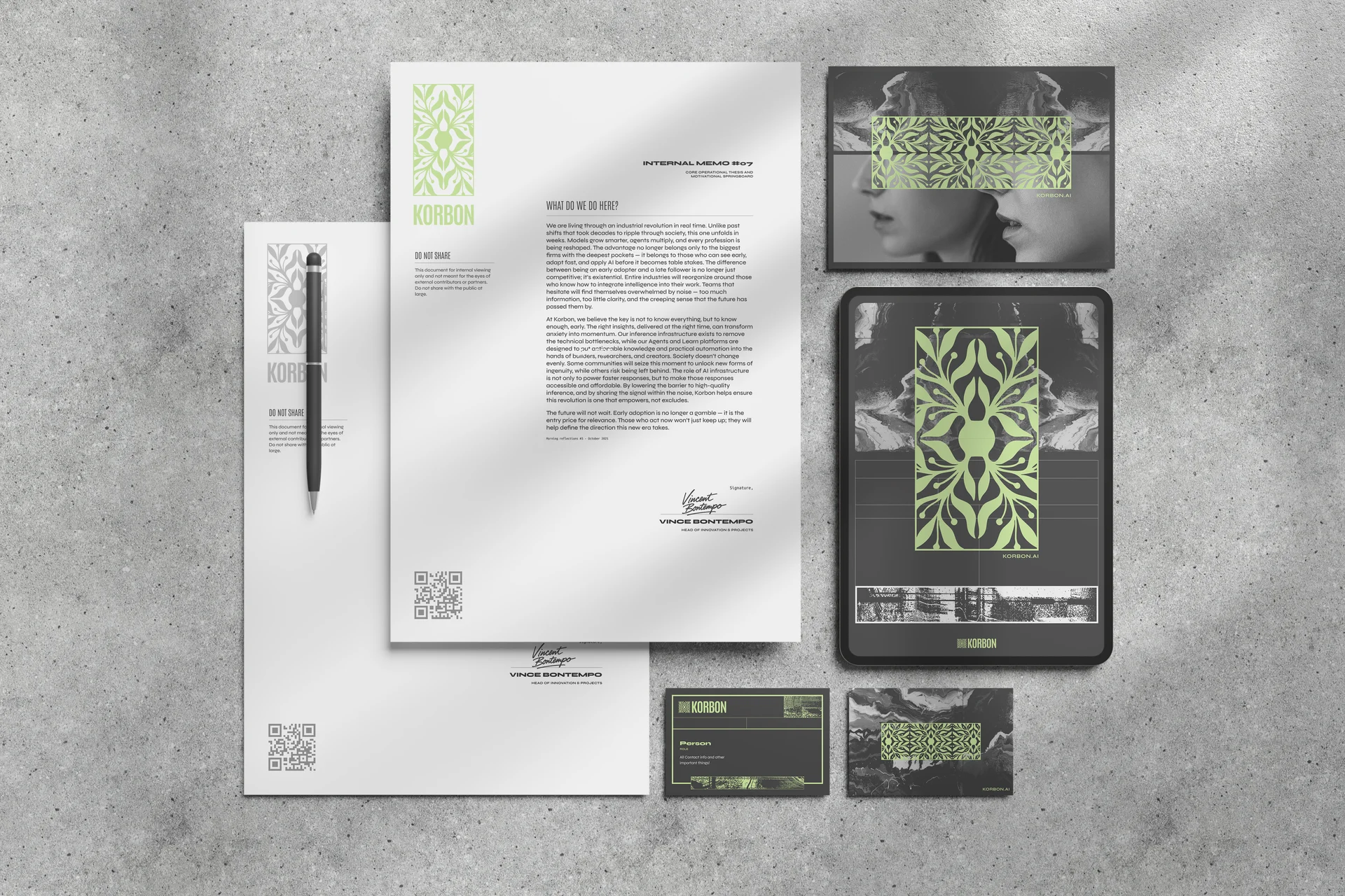 A complete visual identity and brand system for a decentralized AI research collective. The identity gave Korbon a cohesive public presence and a visual language that matches the seriousness of the work.